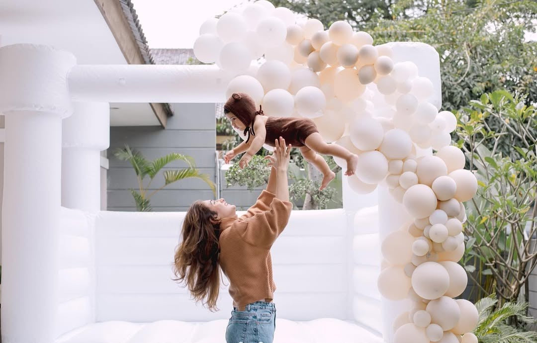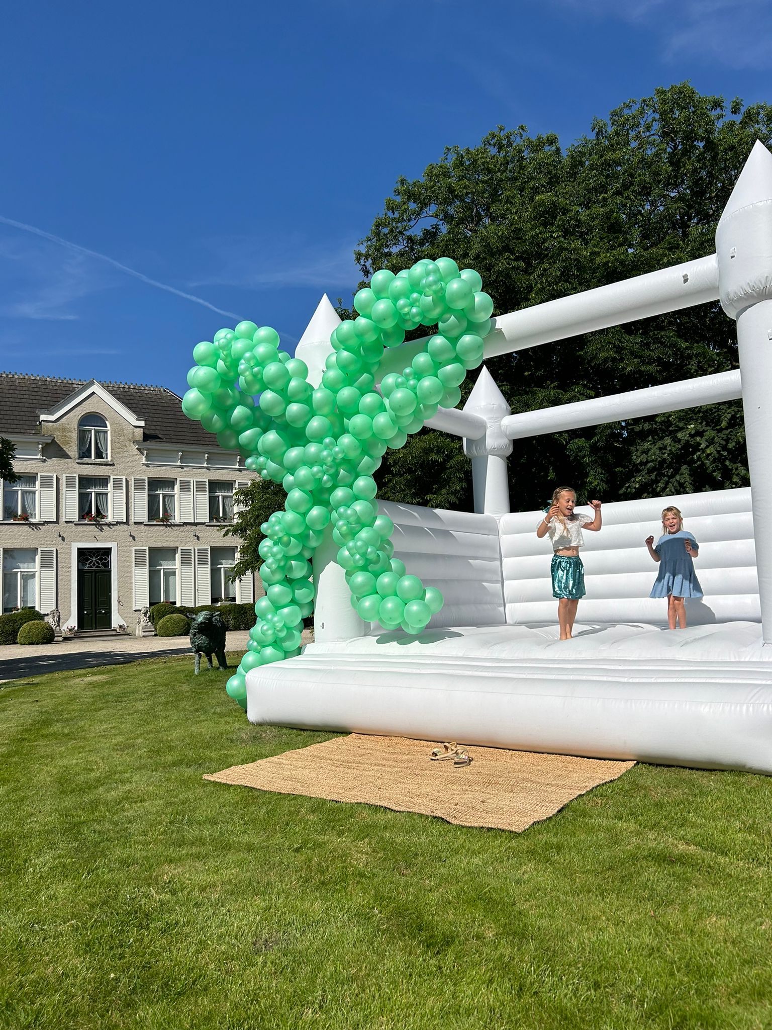De combinatie van witte springkastelen en aangepaste ballondecoratie creëert een prachtig decor voor foto's en selfies, waardoor gasten de mogelijkheid krijgen om onvergetelijke herinneringen vast te leggen en te delen op sociale media.